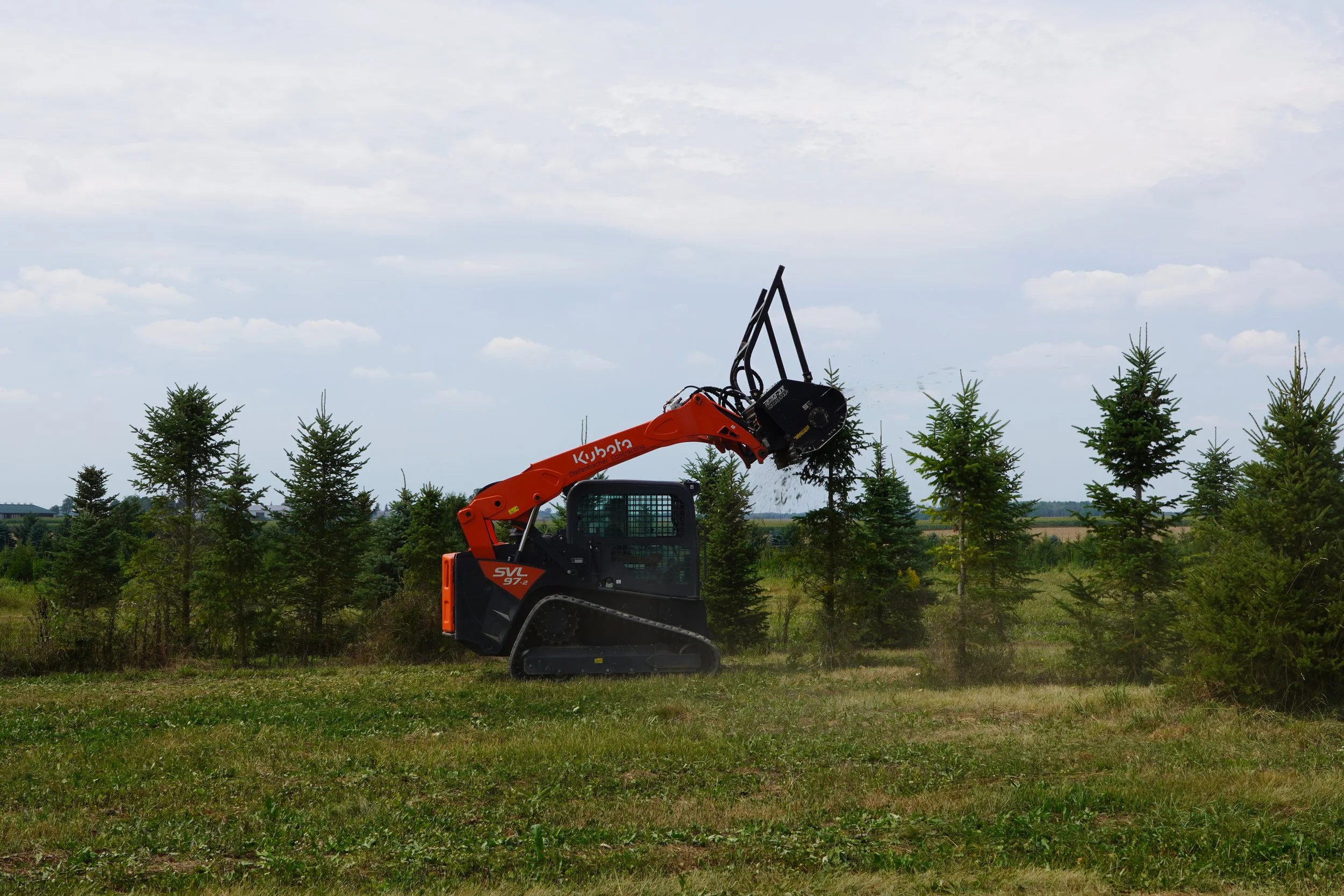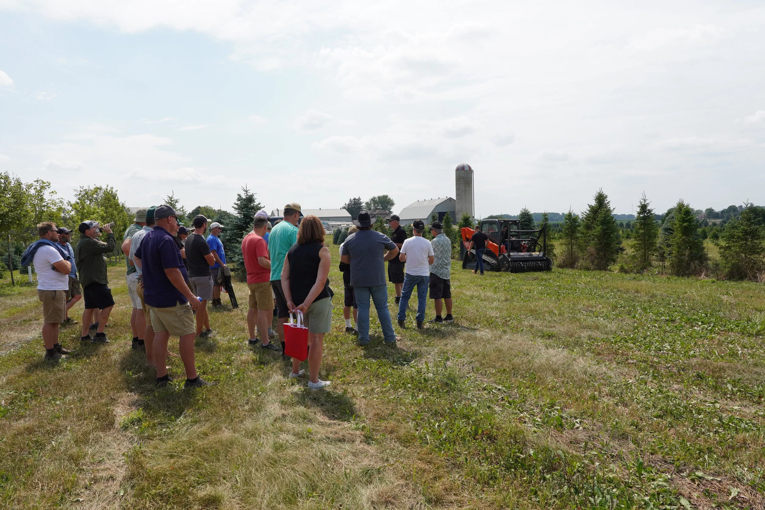 Farm tours were held throughout the day, during which the hosting farm had the opportunity to show behind-the-scenes operations and demonstrate various farming activities, such as pruning. Attendees were able to catch a ride on a peoplemover wagon and see the fields of choose-and-cut Christmas trees - the same experience offered to guests during harvesting season. During these tours, discussions of best practices and advice sharing took place, allowing growers to learn from one another and strengthen their community. Demonstrations of various farm equipment were provided by Diefenbacher Contracting, including a live demonstration of tree removal that transformed an unusable tree into mulch in seconds, as well as a subsoiling machine that tilled the ground into usable soil.